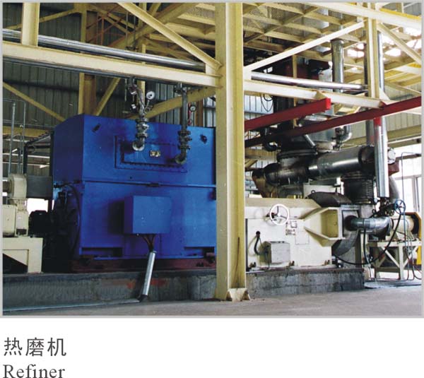 木片经运输设备送入热磨机上料仓,然后经过螺旋进料器均匀进入预热蒸煮器,将木片蒸煮软化,使纤维更易分离,蒸煮后的木片在热和机械作用下分离成纤维。